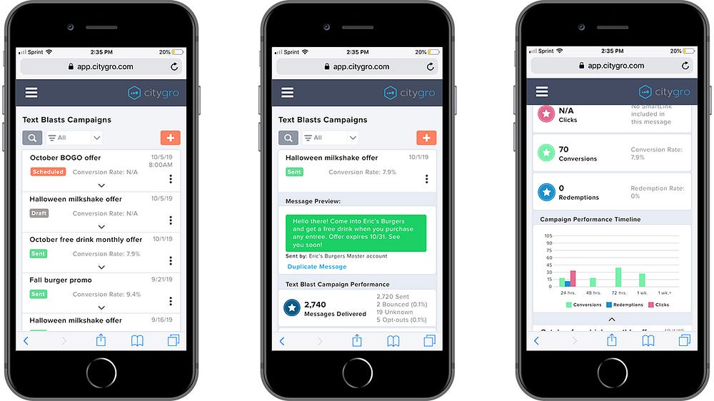 CityGro (now known as Patch) is a small business focused on customer retention software. Their CRM platform lets businesses manage accounts, customize kiosk flows and waivers, run SMS conversations, and send targeted SMS and email blasts triggered by customer behavior.