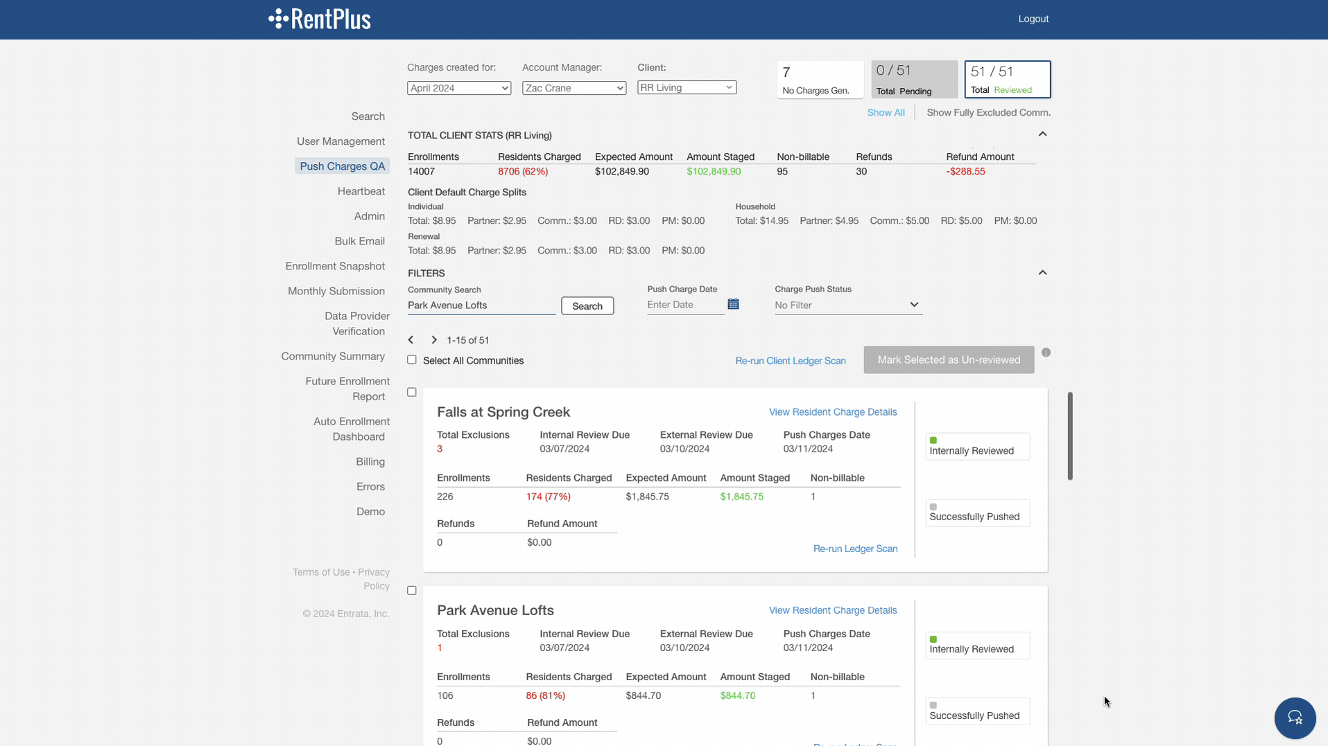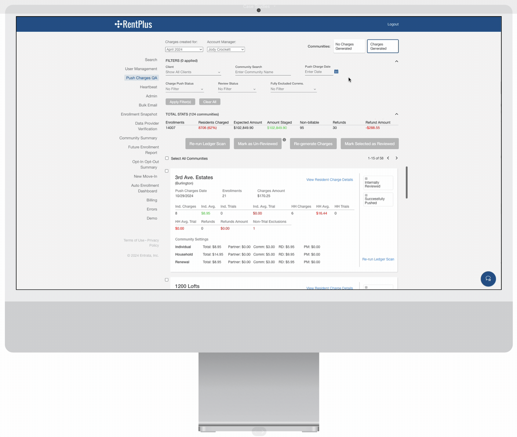 In 2021, Rent Dynamics released a new feature that streamlined the process of pushing RentPlus charges directly to clients’ property management systems and onto their residents’ ledgers. Within the RentPlus Admin application, Account Managers can QA and approve generated charges for their clients. They can view overall client-level statistics, drill down to community-level details, and examine individual resident charges, approving or rejecting those with errors or discrepancies.