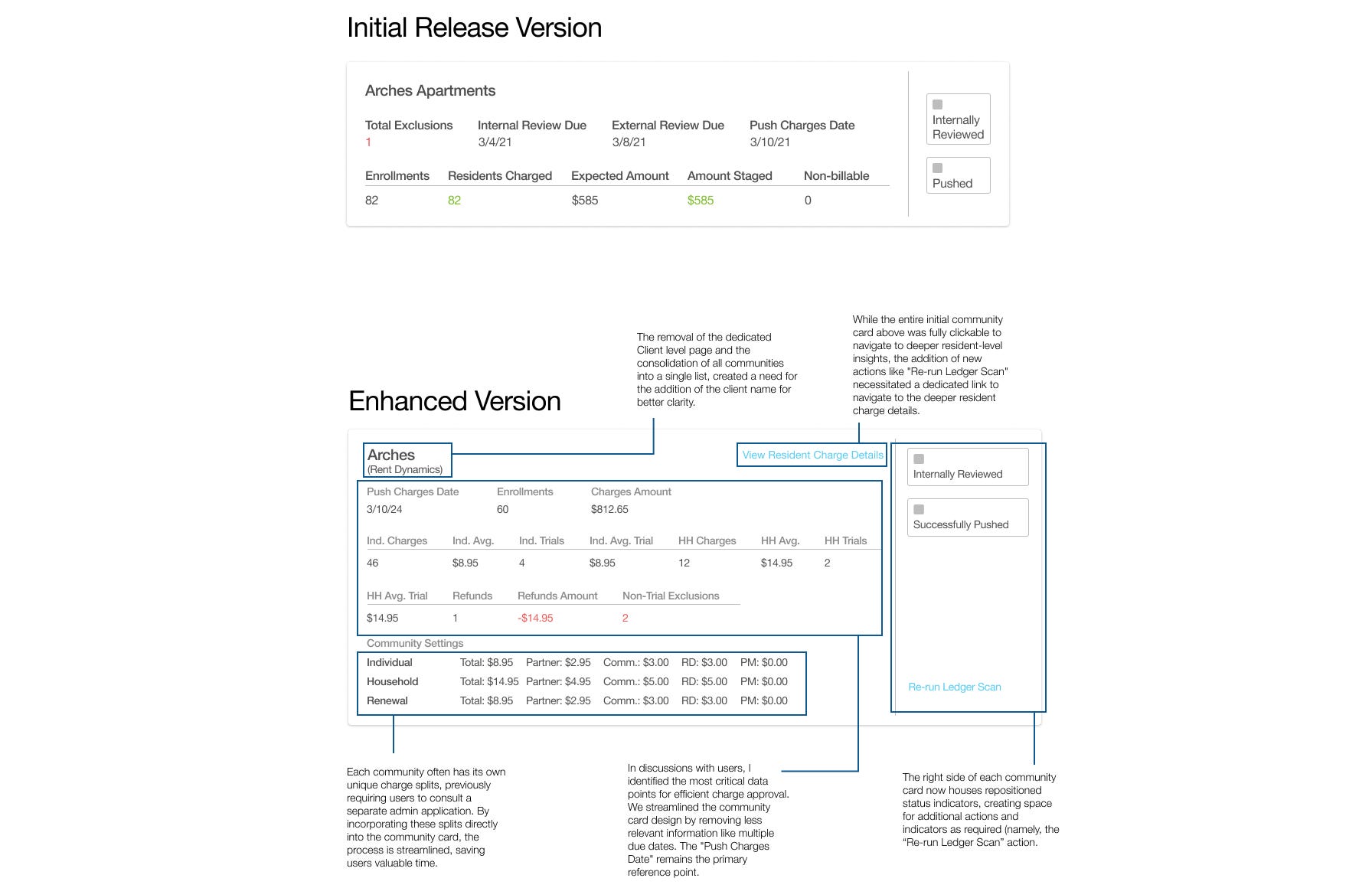Based on the initial research and discussions with users, we discovered that there were other data points that would be more helpful to have surface on the Community charge summary cards. These new data points would allow users to more confidently QA and approve charges at a glance, saving them time on this important task.